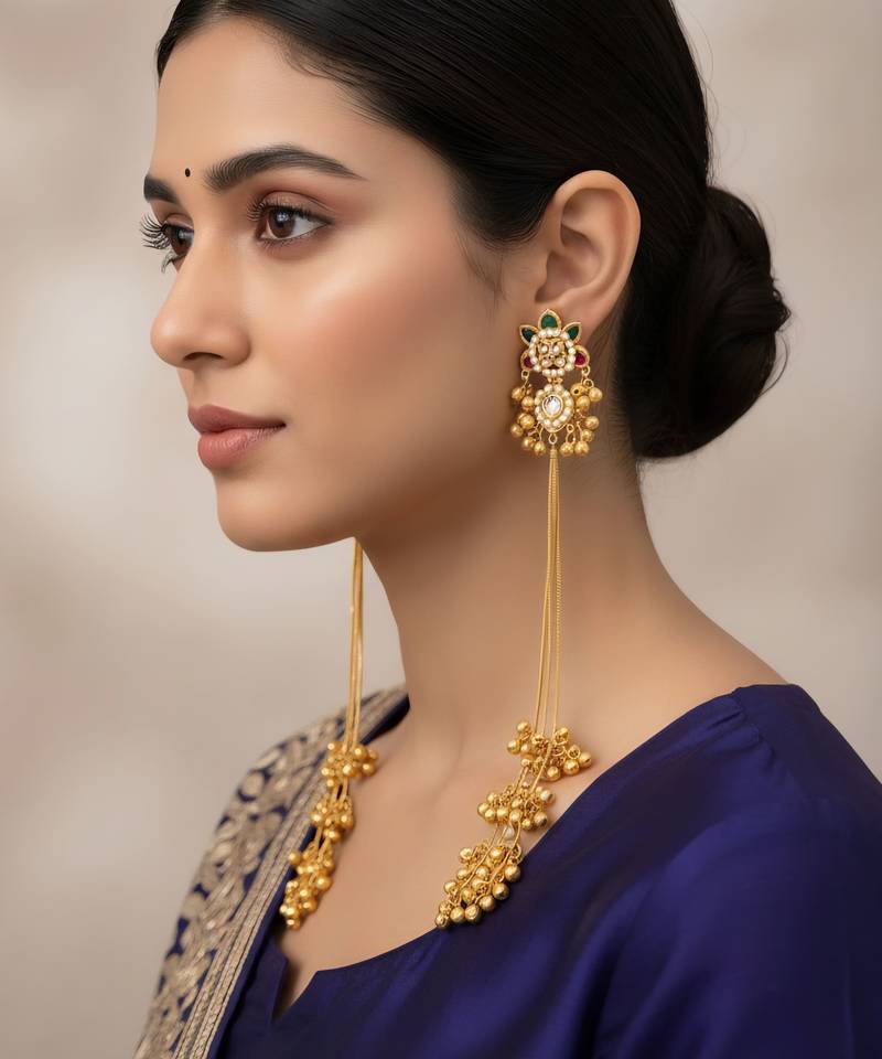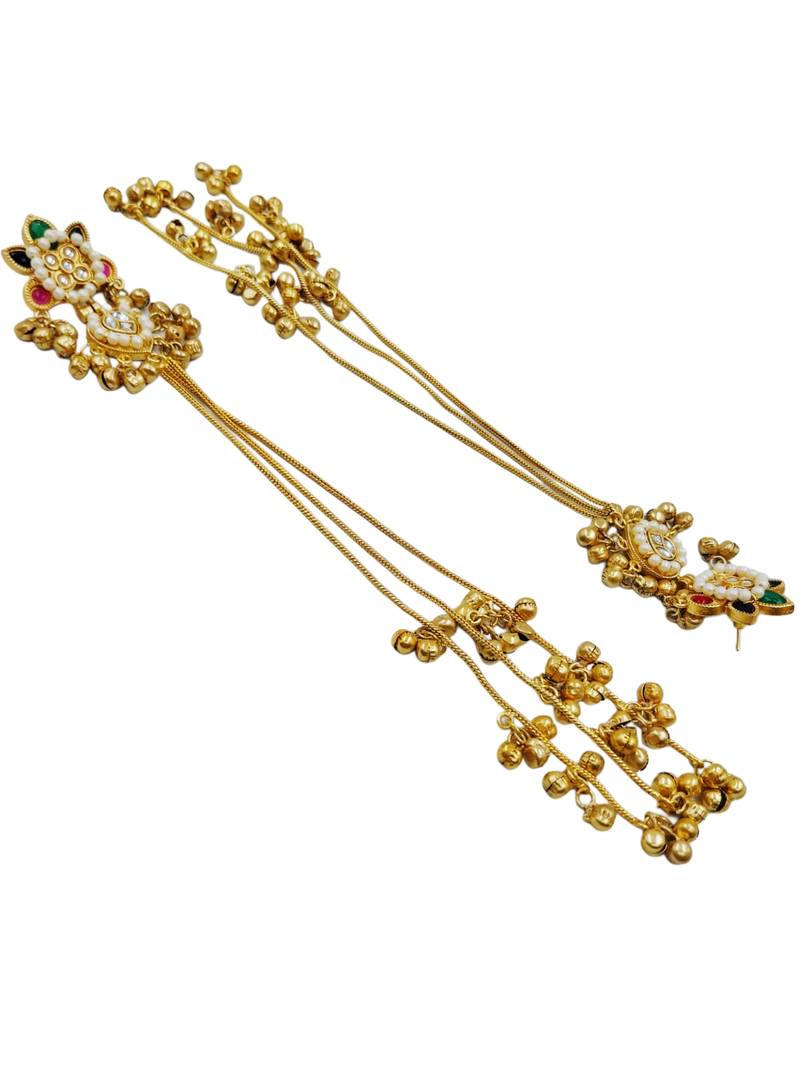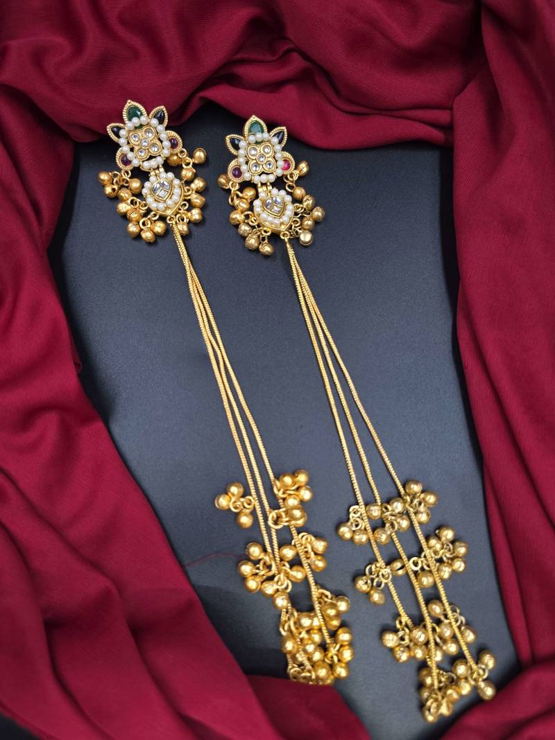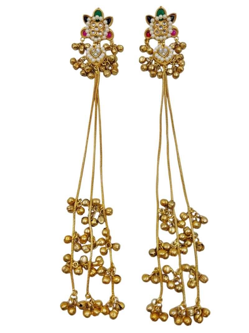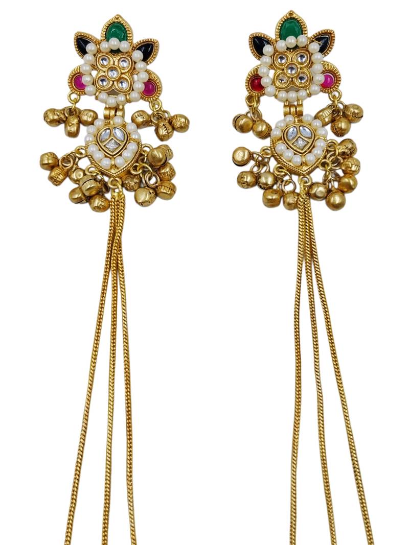 | Product Name | Traditional Gold Plated Kashmiri Jhumka Earrings With Long Chains Ruby & Green Stone | |