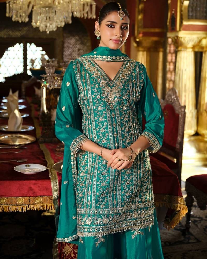 Blue heavy chinon silk full stitched free size upto 44 palazzo suits
