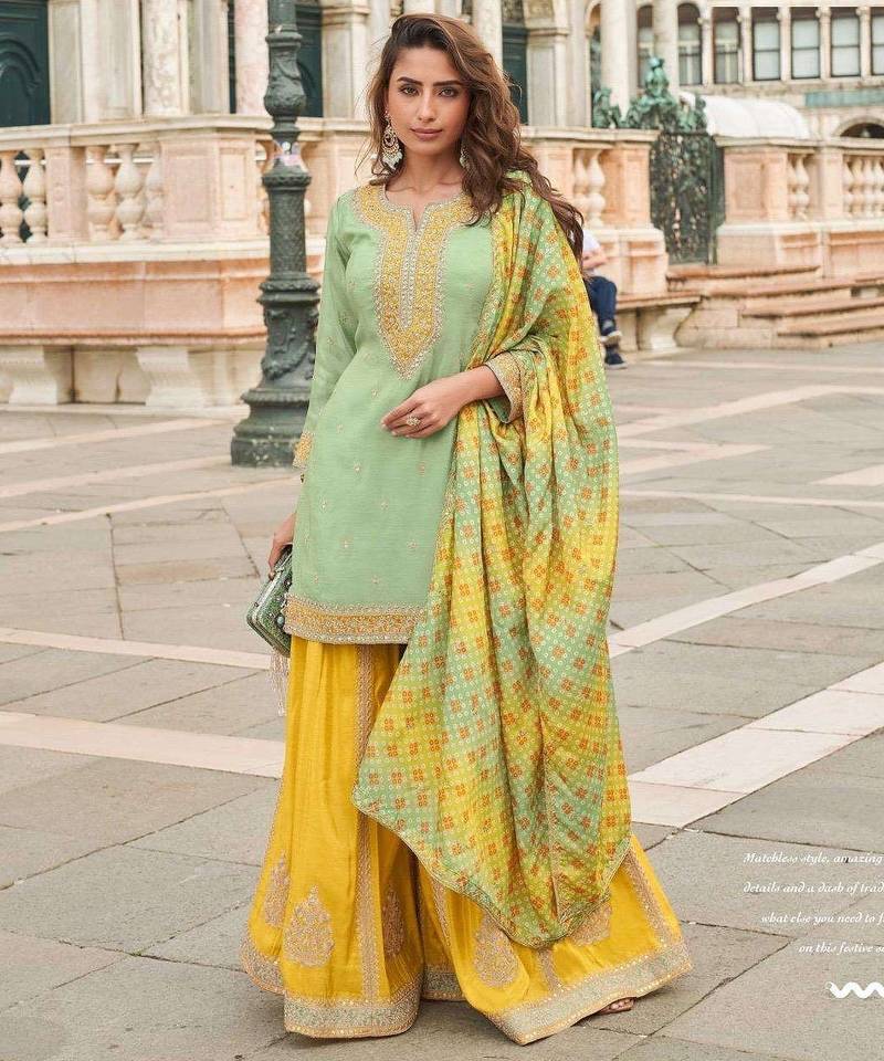 Mint green shimmer silk wedding sharara suits free size upto 44 stitched