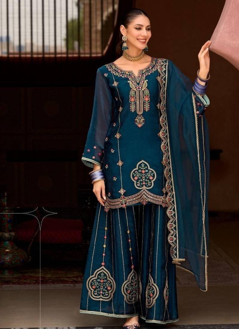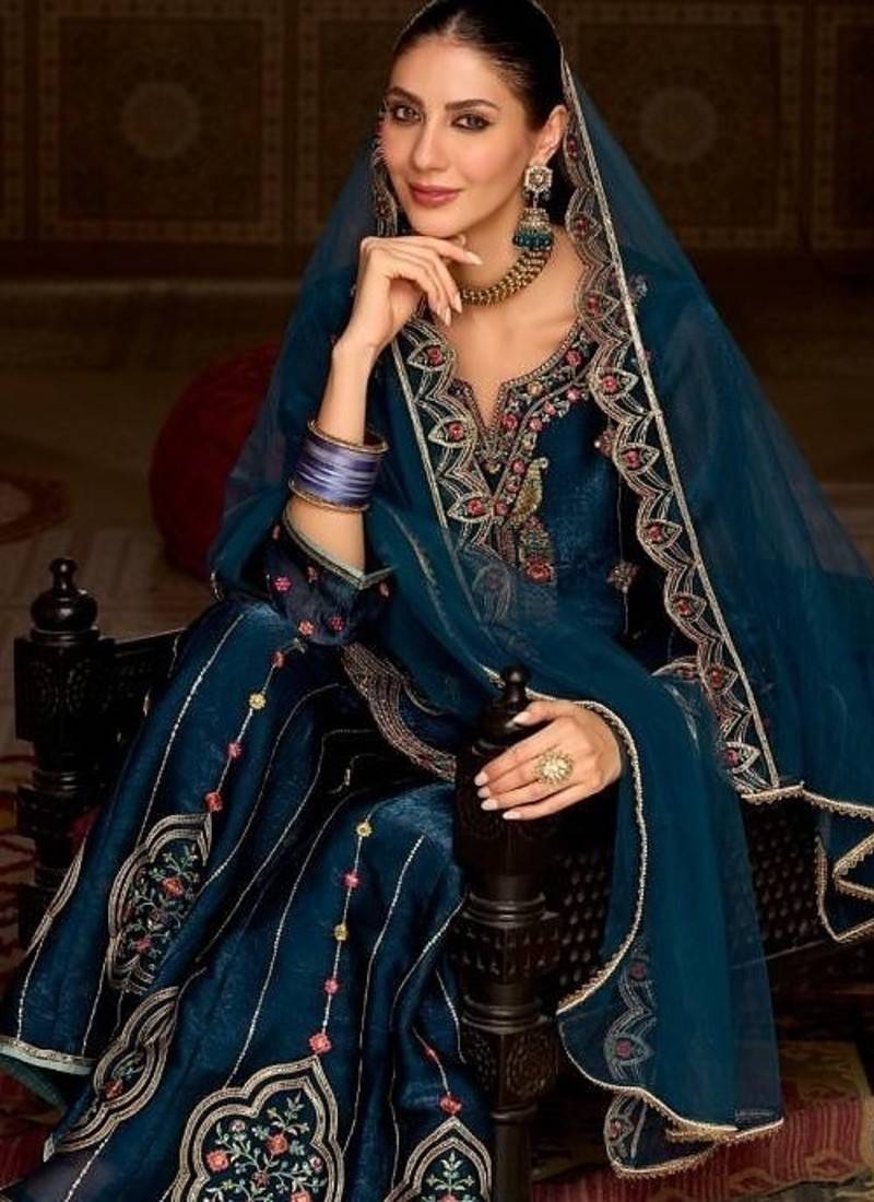 Peacock blue tissue silk wedding sharara suits - full stitched free size