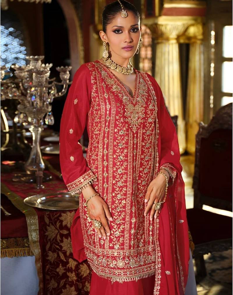 Red heavy chinon silk full stitched free size upto 44 palazzo suits