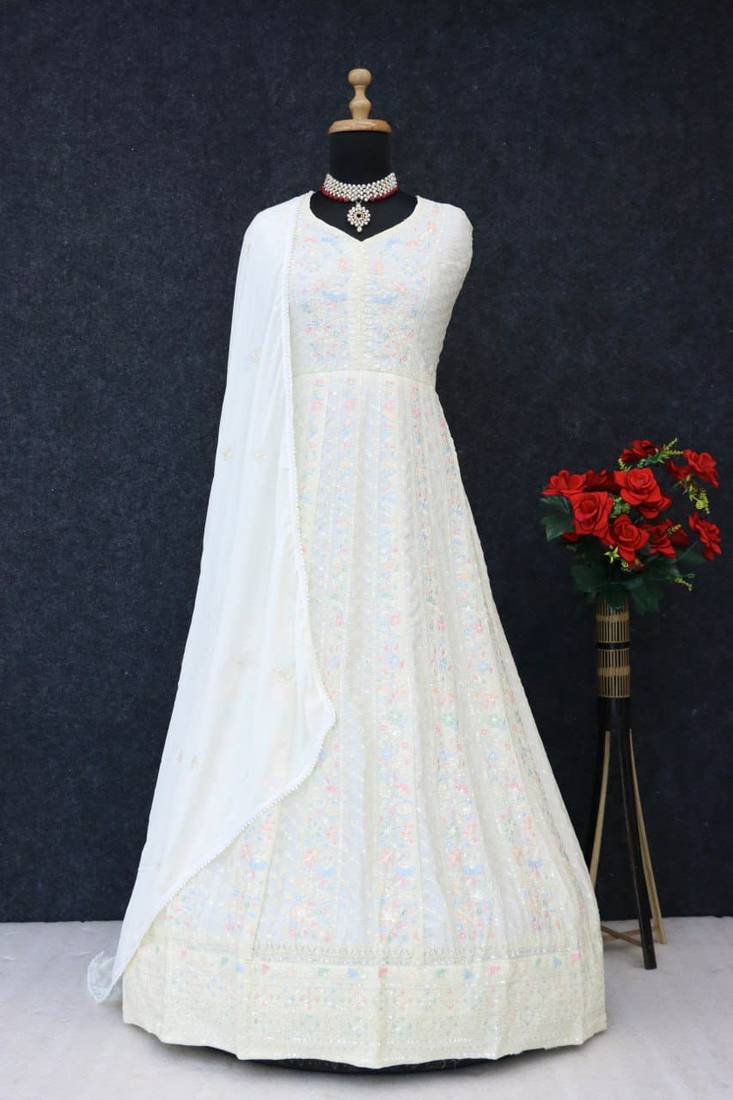 White chinon silk heavy embrodiered semi stitched wedding gowns