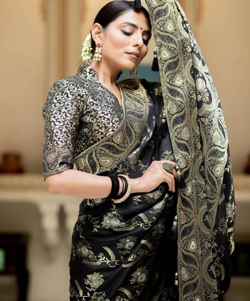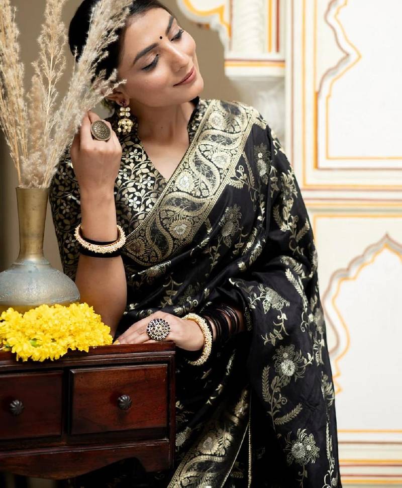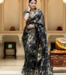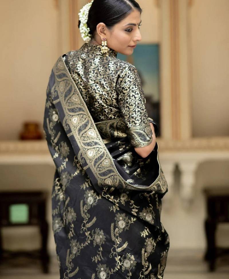 Black soft art silk banarasi jacuard work designer party wear saree with unstitched blouse piece