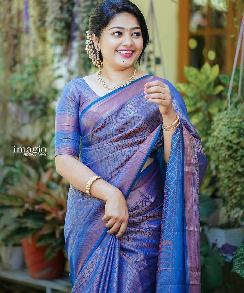 Blue soft art silk banarasi jacuard work designer party wear saree with unstitched blouse piece