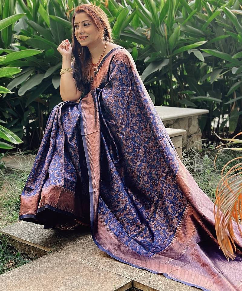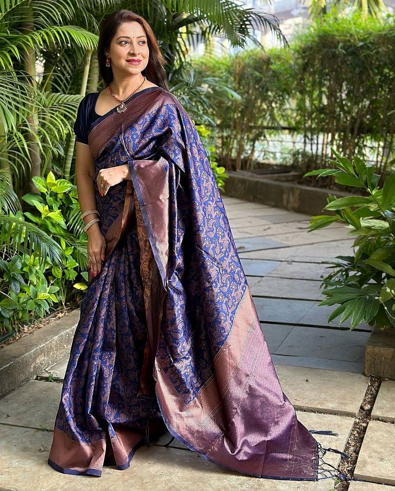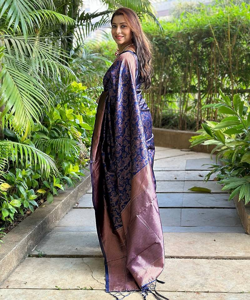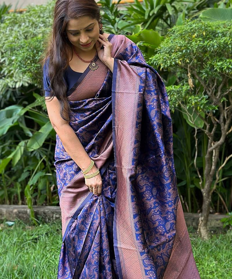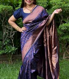 Blue soft art silk banarasi jacuard work designer party wear saree with unstitched blouse piece