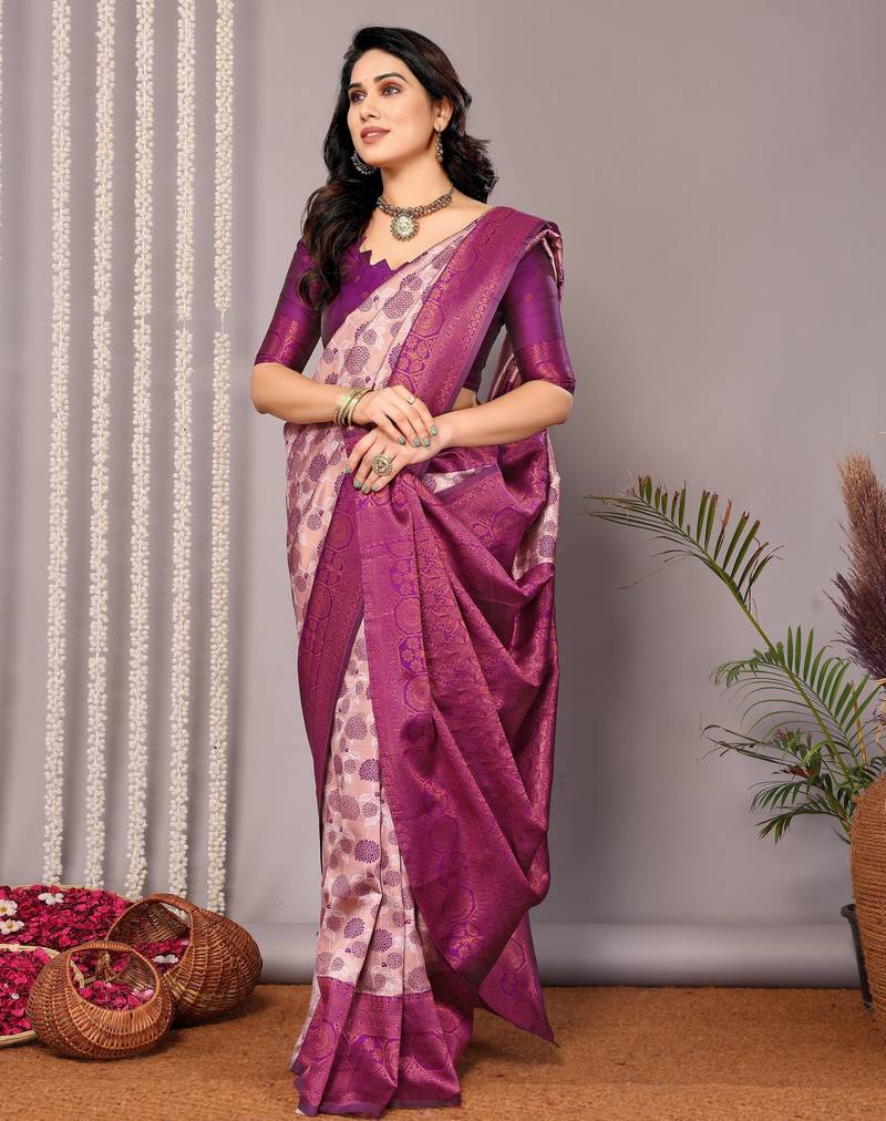 Light peach purple soft silk blend banarasi jacuard work designer party wear saree with unstitched blouse piece
