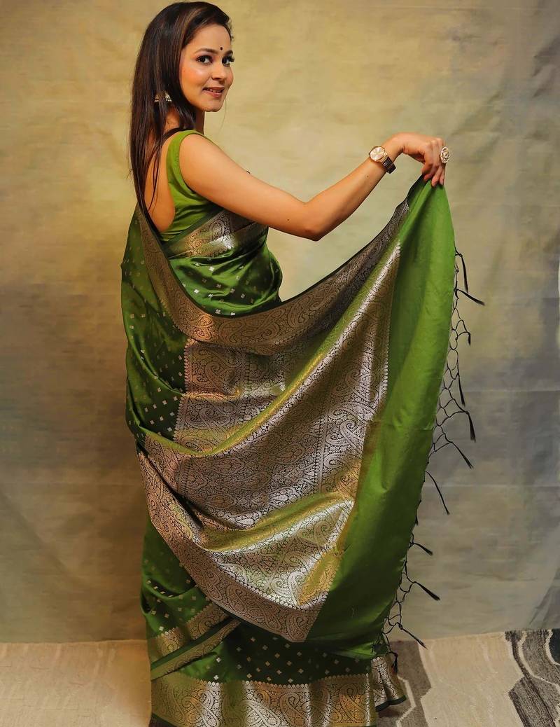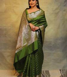 Mehendi soft art silk banarasi jacuard work designer party wear saree with unstitched blouse piece