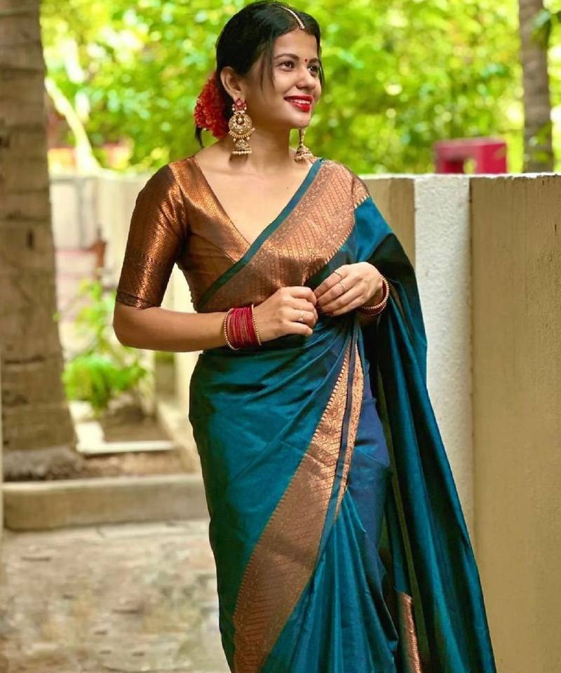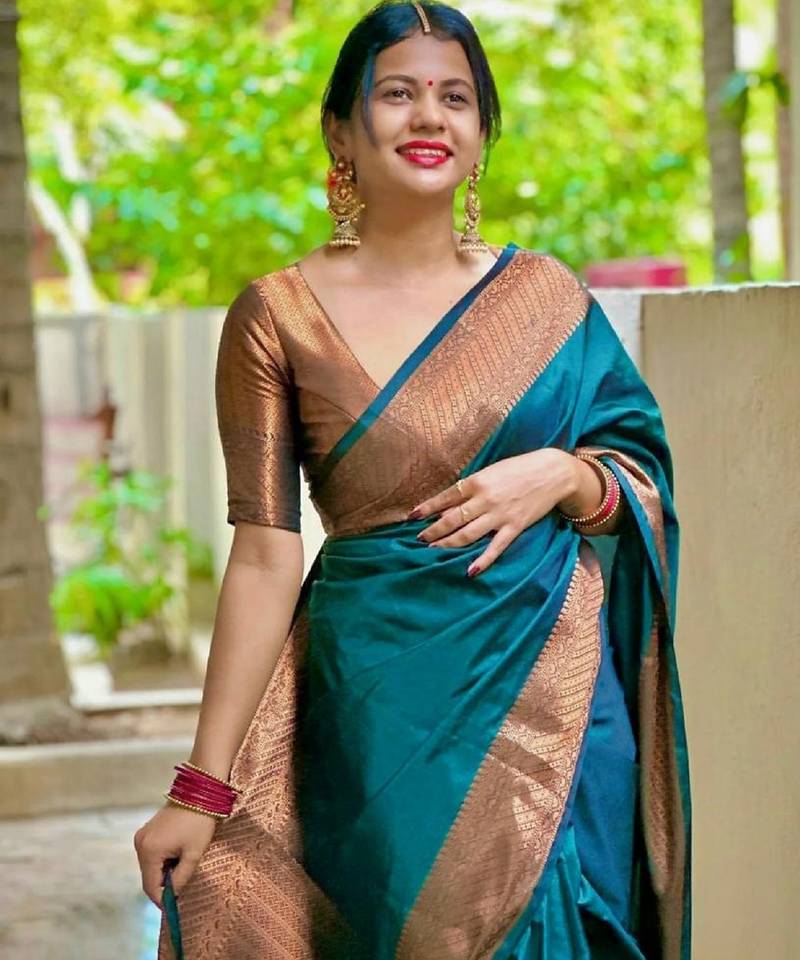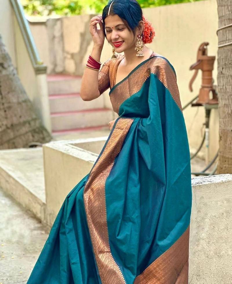 Morpich soft art silk banarasi jacuard work designer party wear saree with unstitched blouse piece