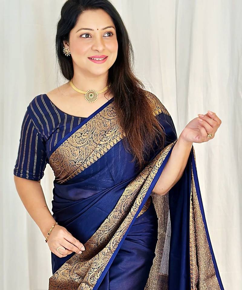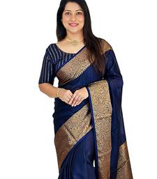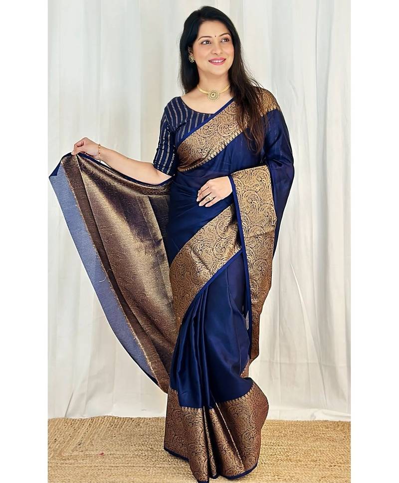 Neavy blue soft art silk banarasi jacuard work designer party wear saree with unstitched blouse piece