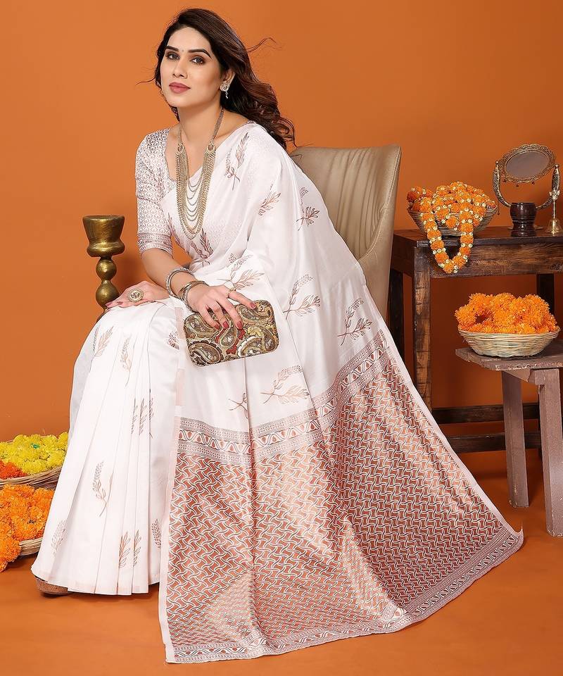 White soft art silk banarasi jacuard work designer party wear saree with unstitched blouse piece