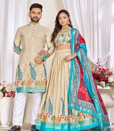 Cream silk men's kurta with payjama and semi stitched lehenga choli couple combo