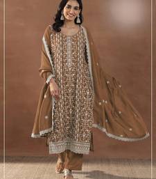 Dark mustard silk semi stitched suit with embroidery & sequence work