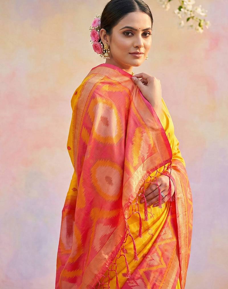 Yellow soft silk printed saree with blouse