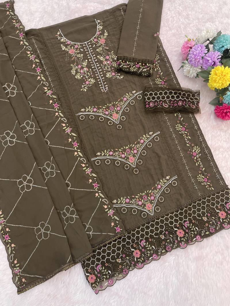 | • | Kameez | : | Color- Mehendi / Fabric- Faux Georgette |