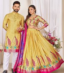 Yellow silk men's kurta with payjama and semi stitched lehenga choli couple combo