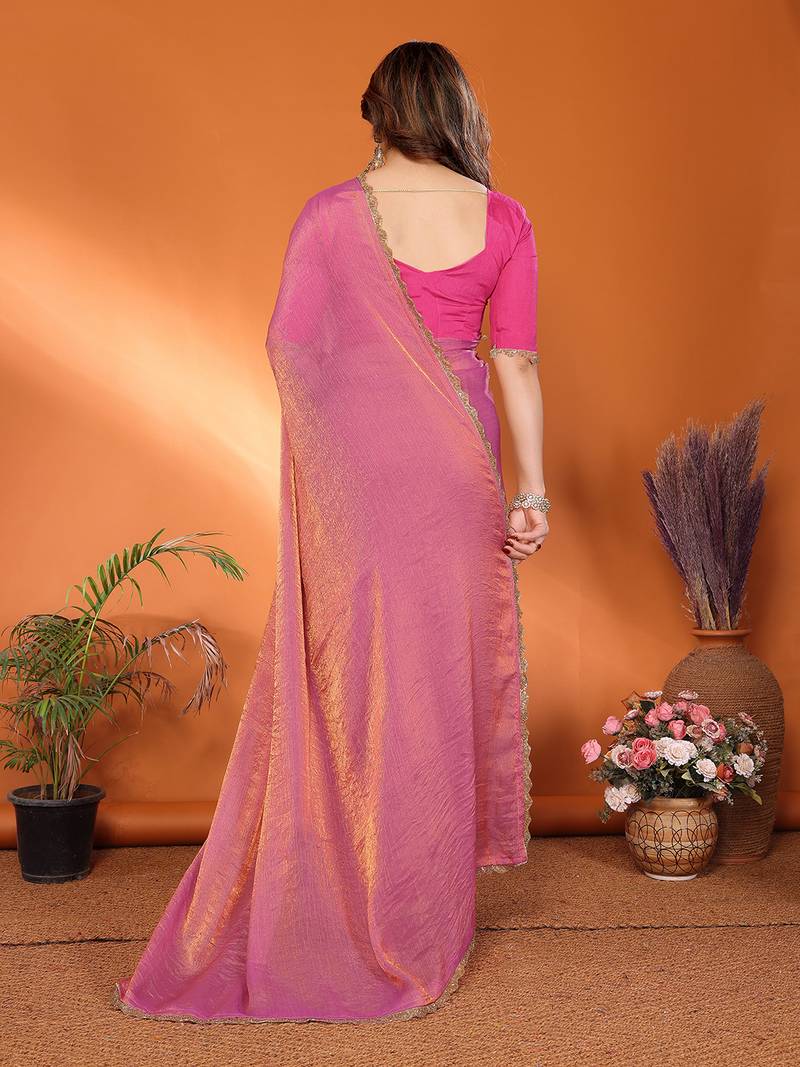 | Product Name | Pink Elegant Embellished Chiffon Saree With Frendi Chinese Border & Blouse Piece | |