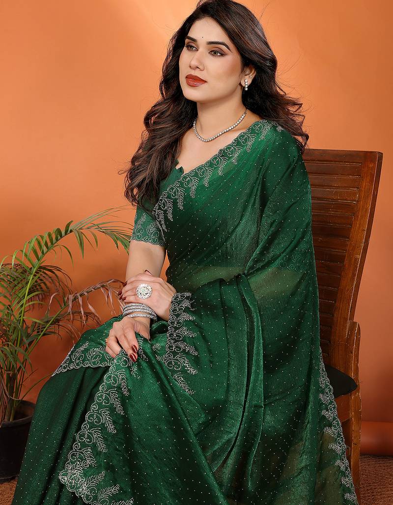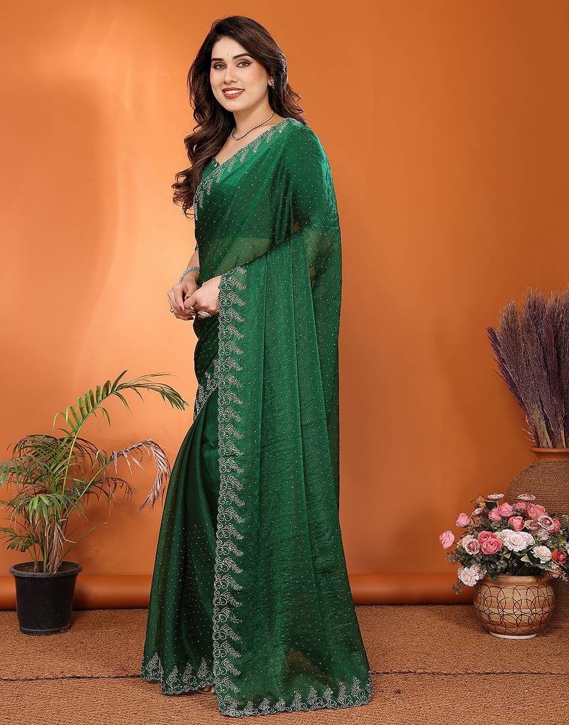 Green elegant embellished jimmy saree with frendi diamond border & blouse piece