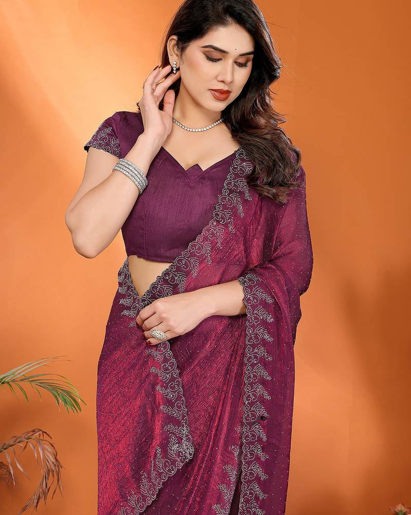 Magenta elegant embellished jimmy saree with frendi diamond border & blouse piece