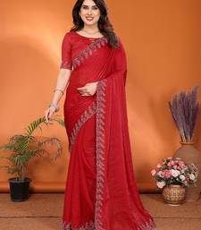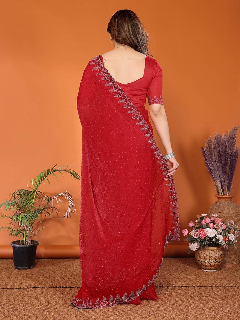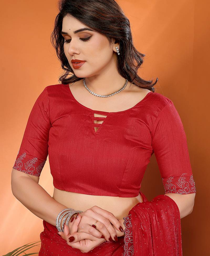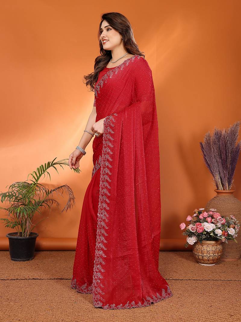 | Product Name | Red Elegant Embellished Jimmy Saree With Frendi Diamond Border & Blouse Piece | |