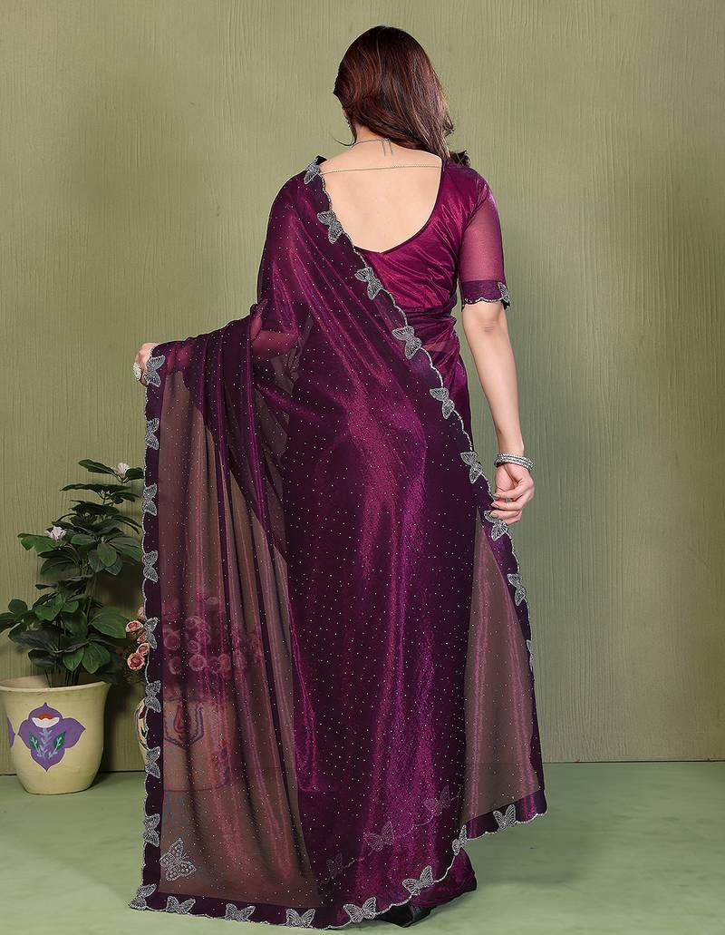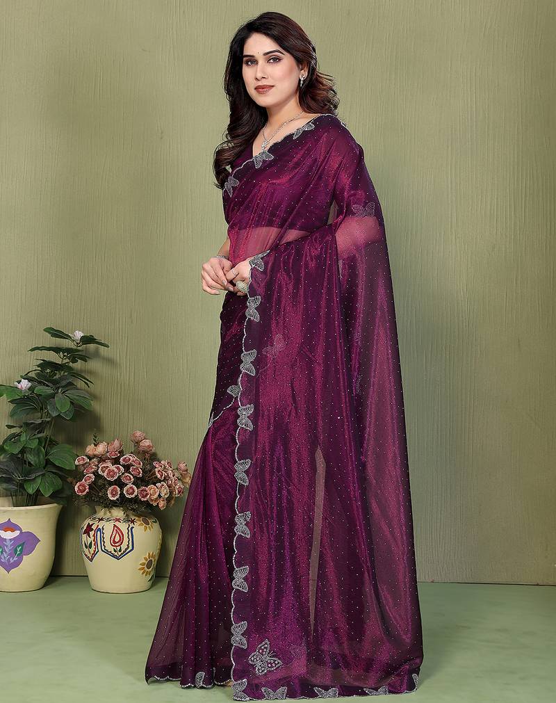 purple embellished net saree with butterfly diamond lace border & blouse piece