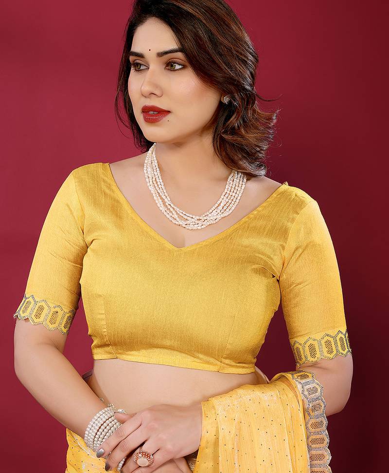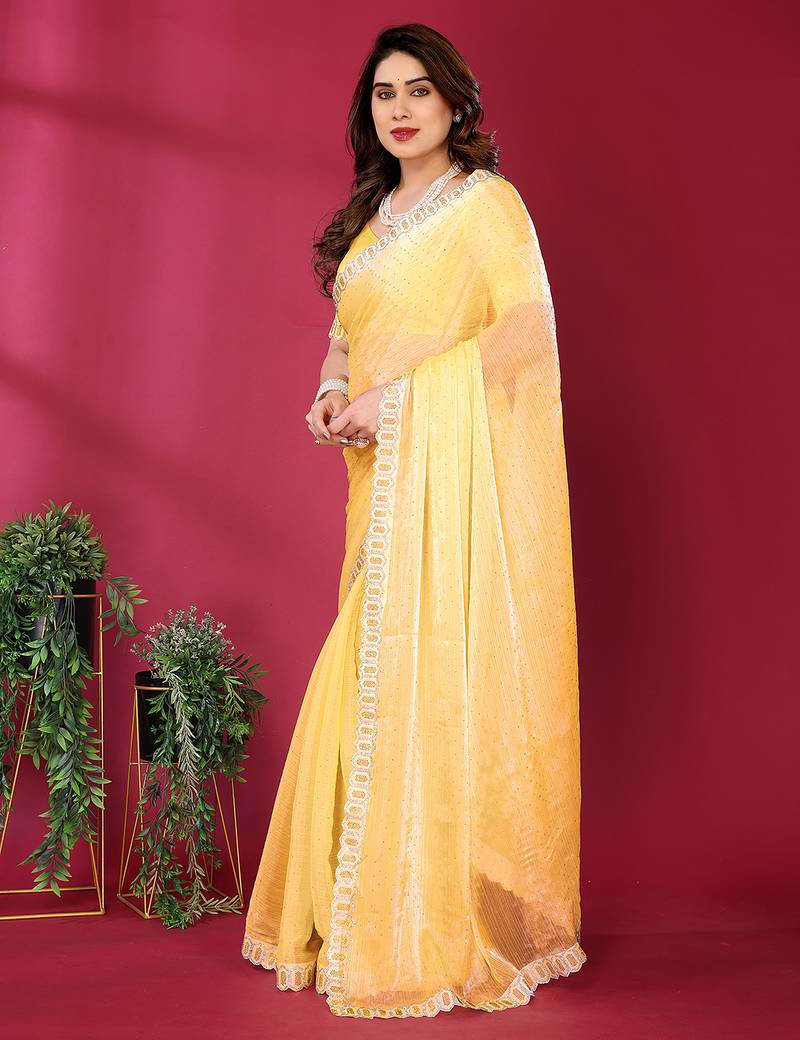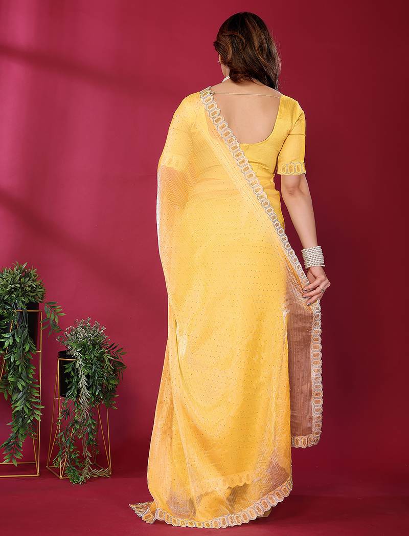 | Product Name | Yellow Embroidered Tissue Saree With Jimmy Choo Lace Border & Blouse Piece | |