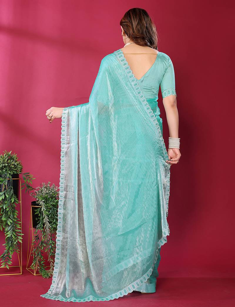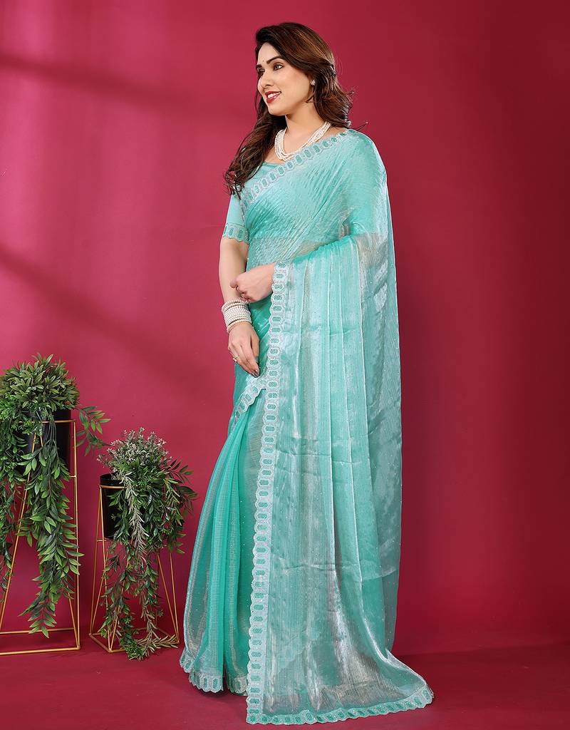 | Product Description | Add A Touch Of Elegance To Your Festive Wardrobe With This Women’s Embroidered Tissue Saree. Crafted From Rich And Lightweight Tissue Fabric, This Saree Offers A Subtle Sheen And Graceful Drape That Enhances Your Overall Look.Beautiful Embroidery Work Adds Refined Charm, While The Highlight Of This Saree Is Its Stylish Jimmy Choo Lace Border, Giving It A Luxurious And Designer Inspired Finish. Perfect For Weddings, Parties, Receptions, And Festive Occasions. |