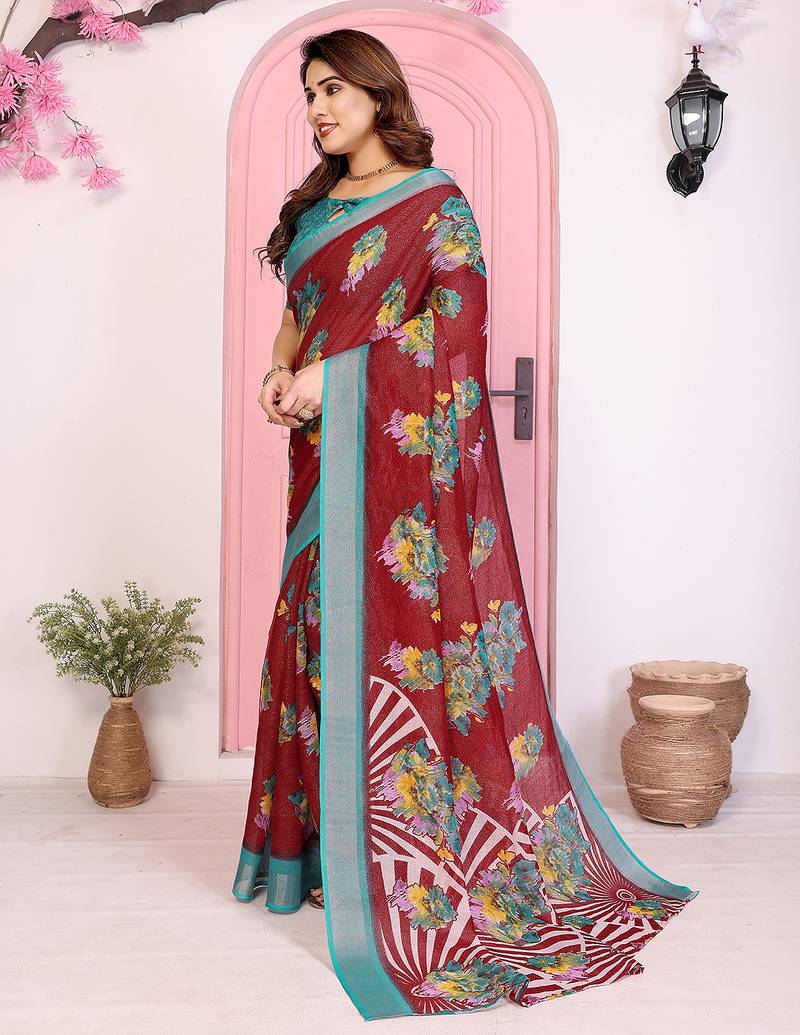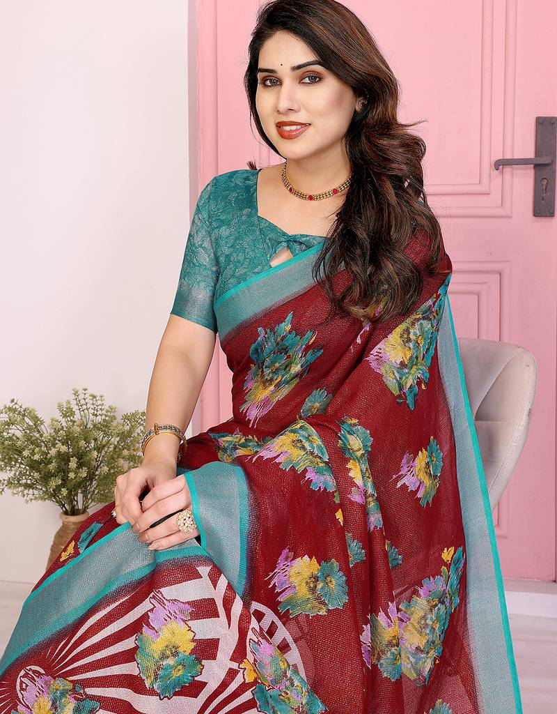 Maroon floral cotton silk saree with shimmer & blouse piece – elegant festive wear