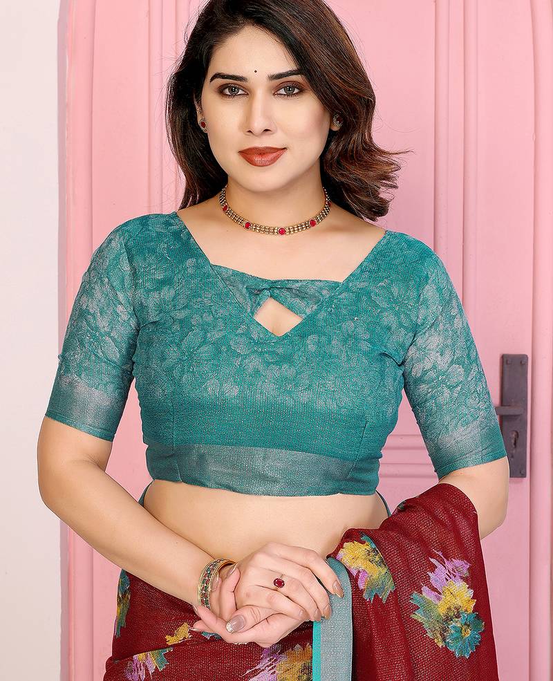 maroon floral cotton silk saree with shimmer & blouse piece – elegant festive wear