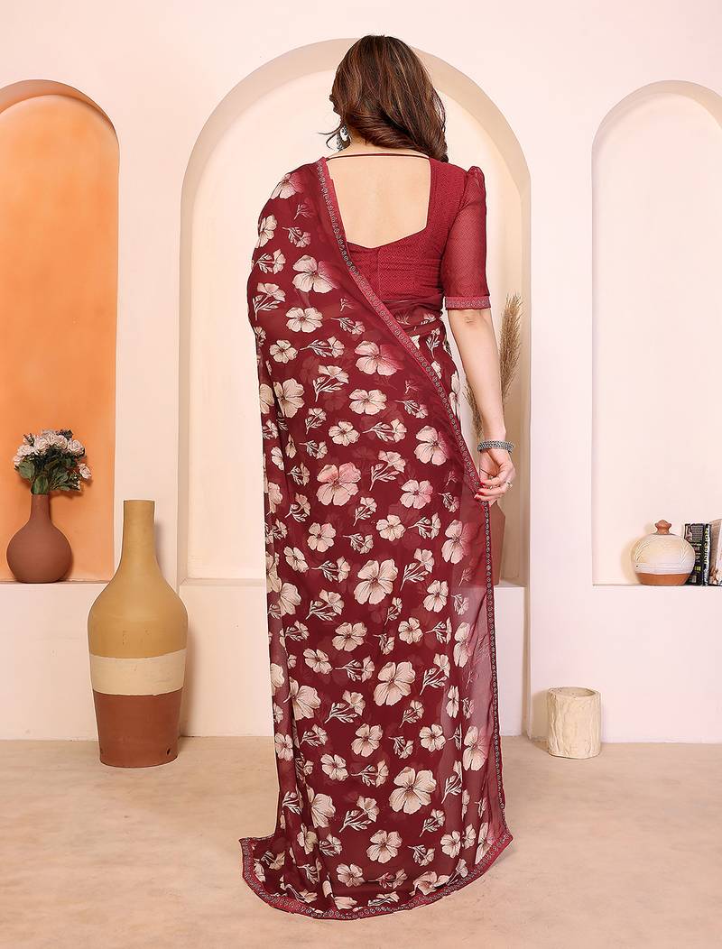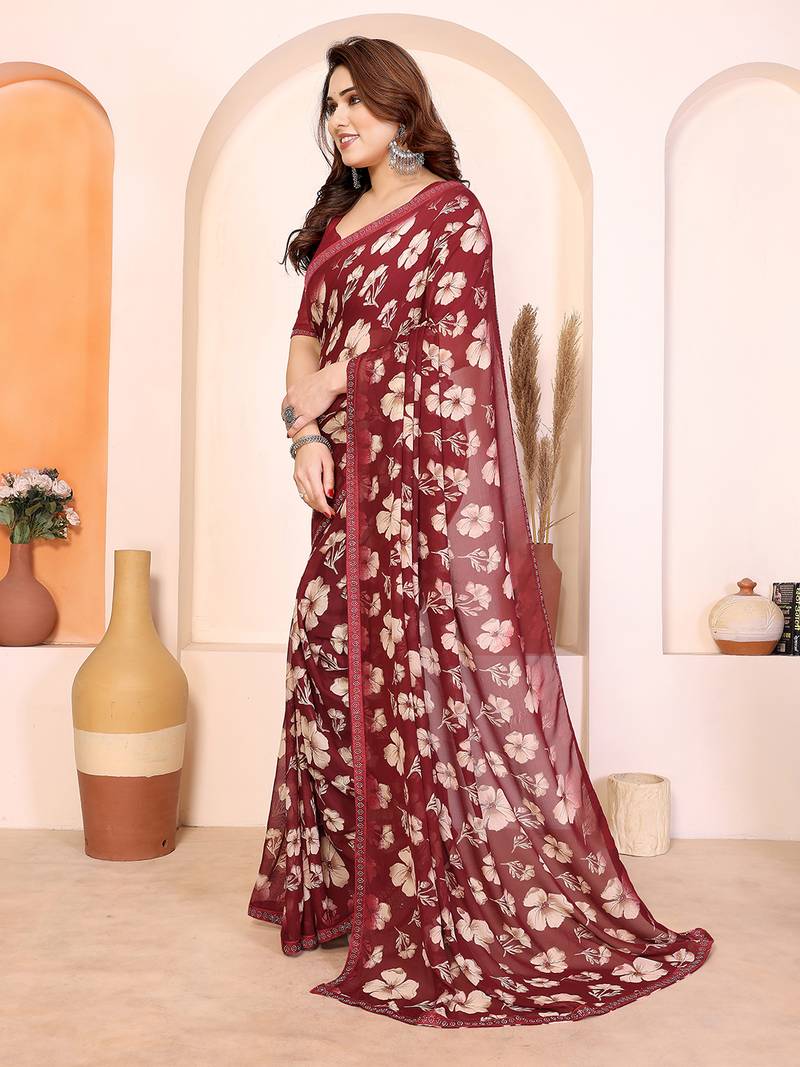 Maroon floral georgette saree with lace border & blouse piece