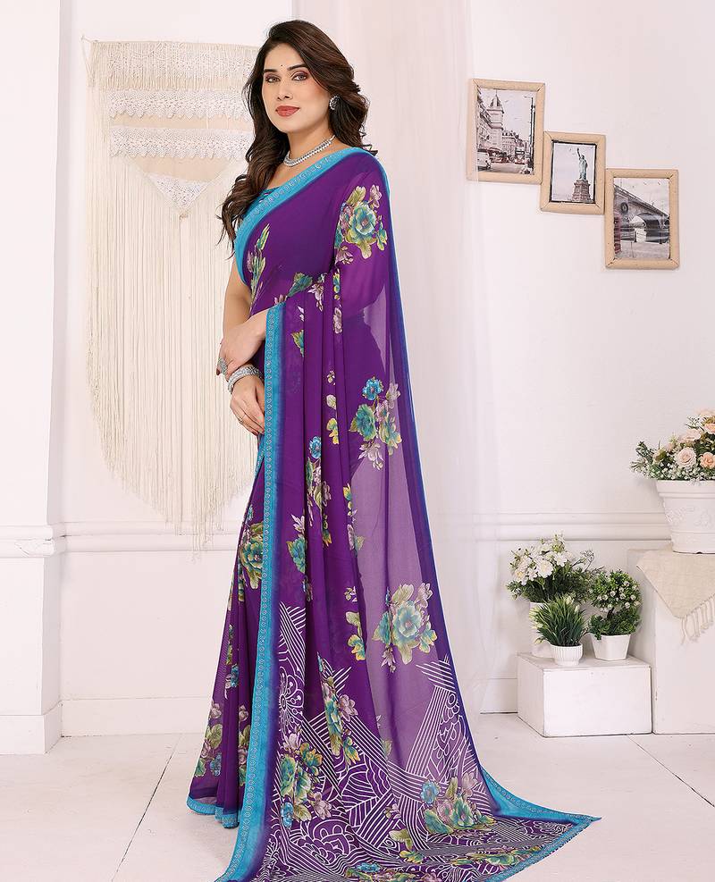purple floral georgette saree with lace border & blouse piece