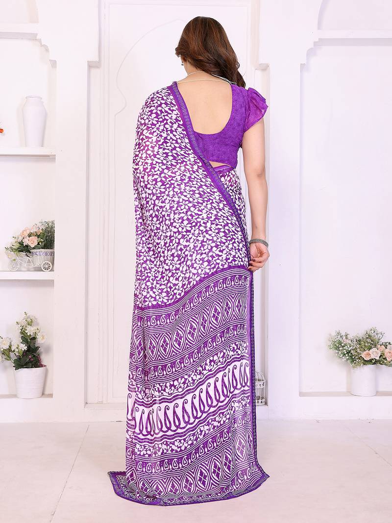 purple floral georgette saree with lace border & blouse piece