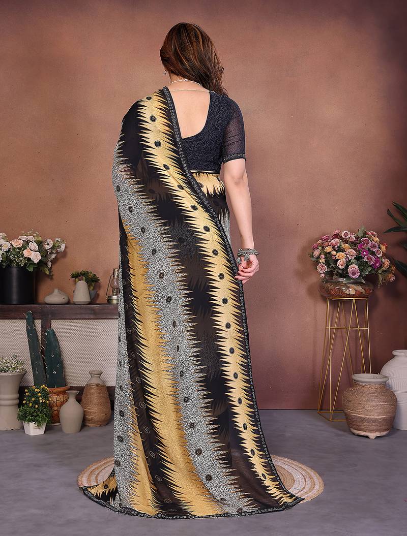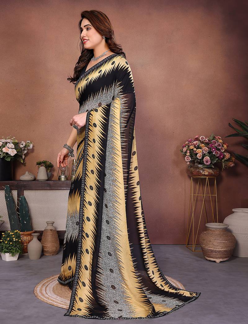 Product Name Black Geometric Print Georgette Saree With Lace Border & Blouse Piece