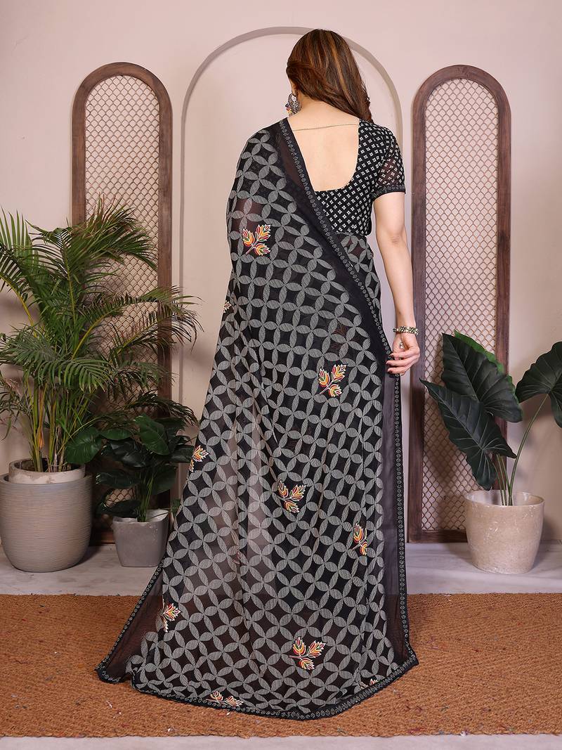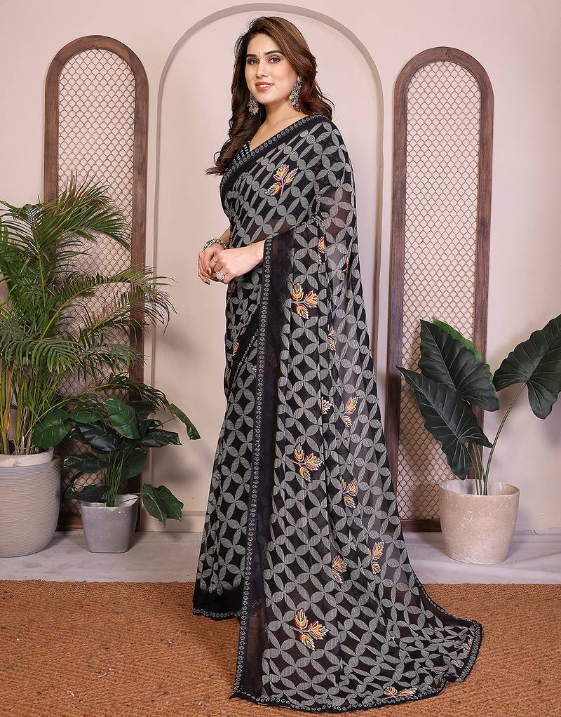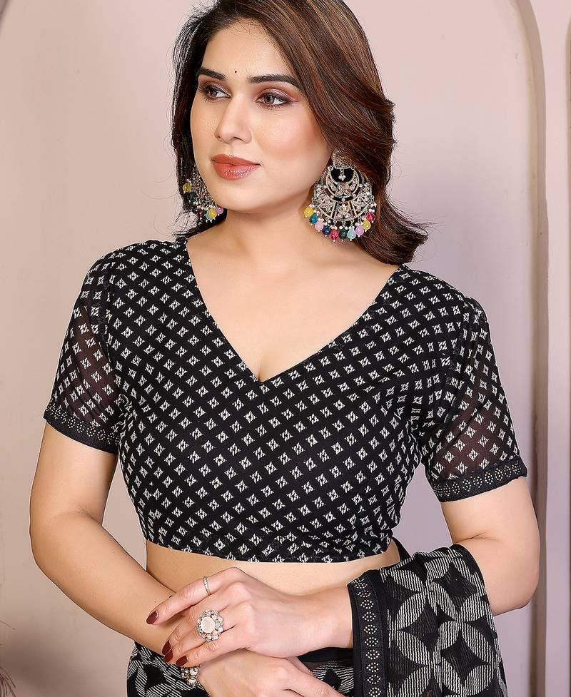 Product Name Black Geometric Print Georgette Saree With Lace Border & Blouse Piece