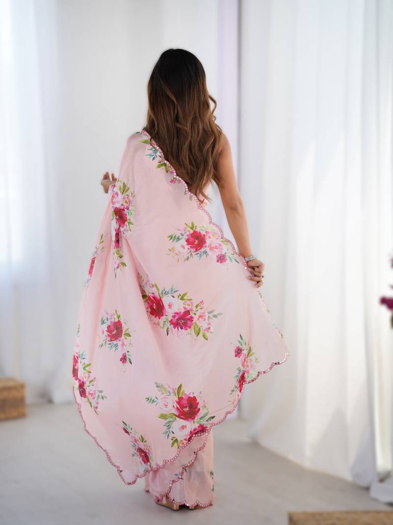 | Product Name | Light Baby Pink Heavy Chinon Printed Saree With Pape Mirror Work & Mirror Border | Designer Party & Wedding Wear Saree | |