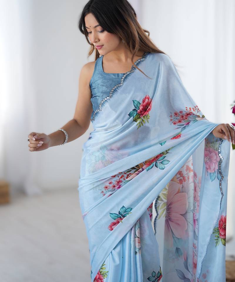 | Product Name | Light Sky Blue Heavy Chinon Printed Saree With Pape Mirror Work & Mirror Border | Designer Party & Wedding Wear Saree | |