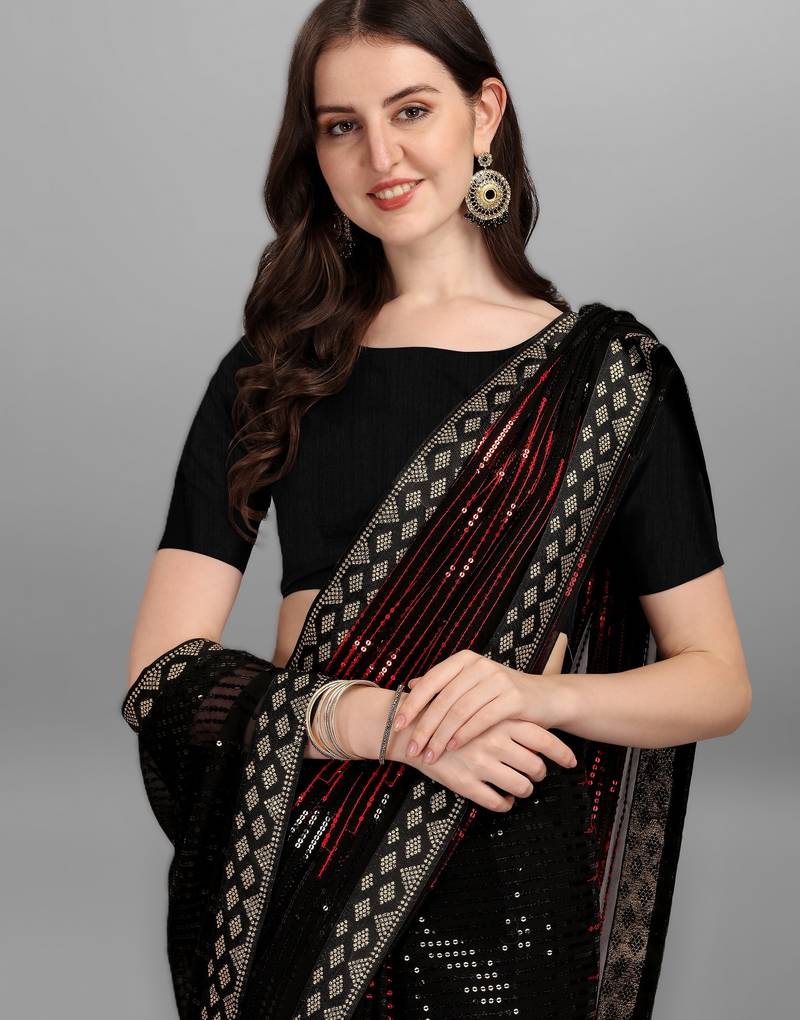 Red heavy georgette designer saree with double run sequins embroidery & satin lace border