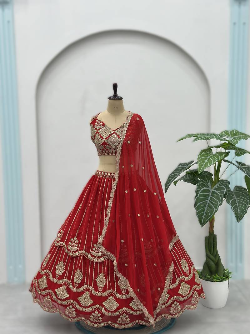 | Product Description | Royal Red Faux Georgette Designer Lehenga With Sequins And Detailed Zari Embroidery Across The Skirt And Bodice, Complemented By A Matching Dupatta With Consistent Design Elements. Sequins Reflect Subtle Shine Against The Rich Red Tone Of The Fabric, And The Zari Work Adds Intricate Thread Based Texture Throughout The Ensemble. The Georgette Base Supports Graceful Drape And Silhouette Movement. |