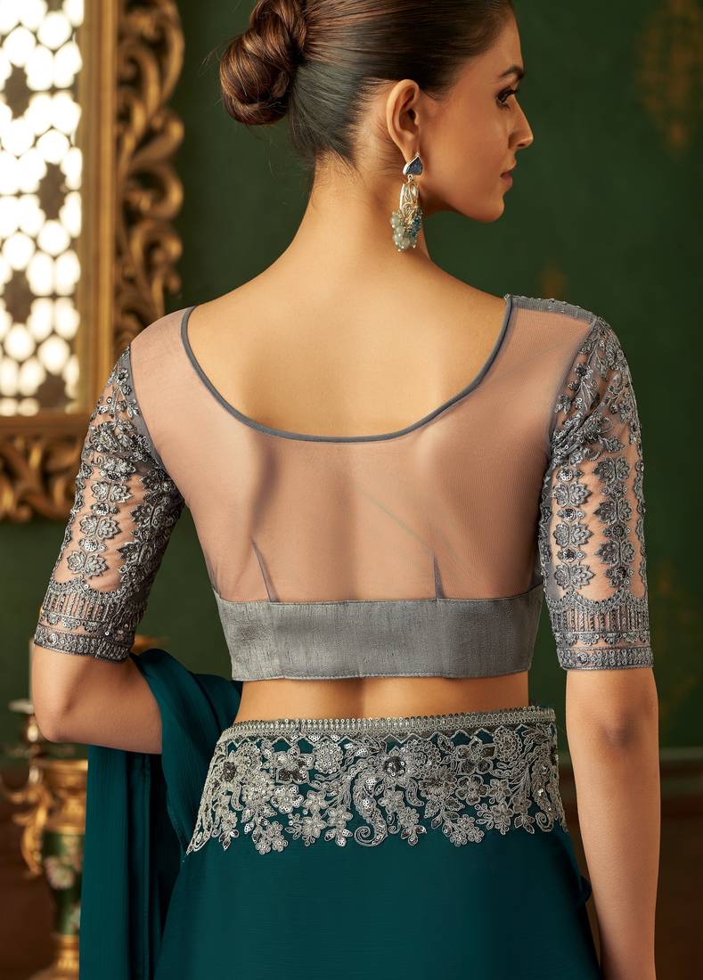 Seagreen heavy chiffon silk blend saree with embroidery with unstitched blouse