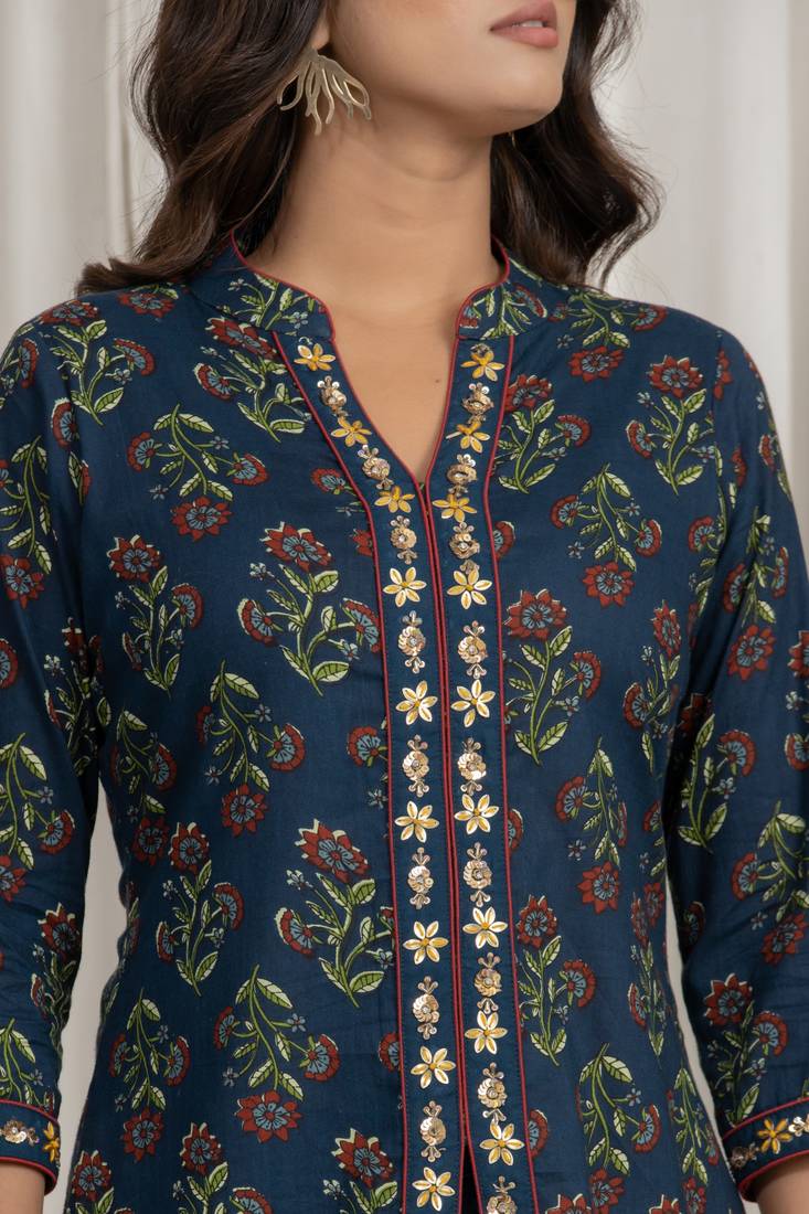Product Name Navy Blue Embroidered Short Kurti