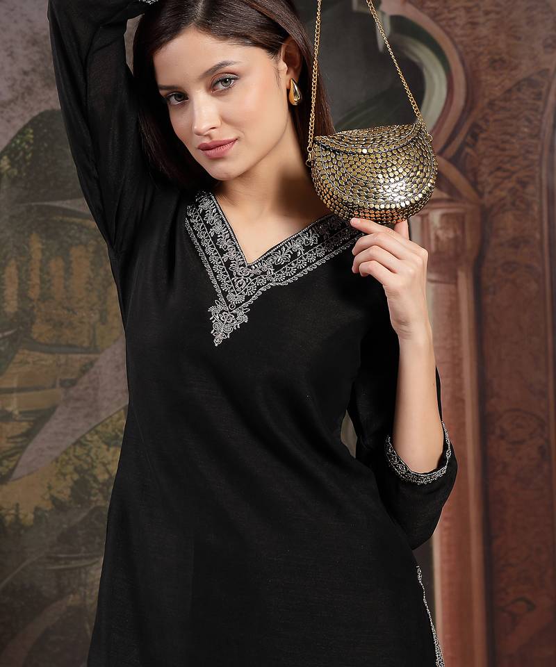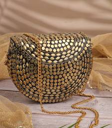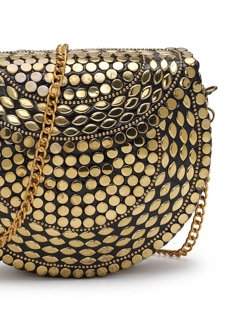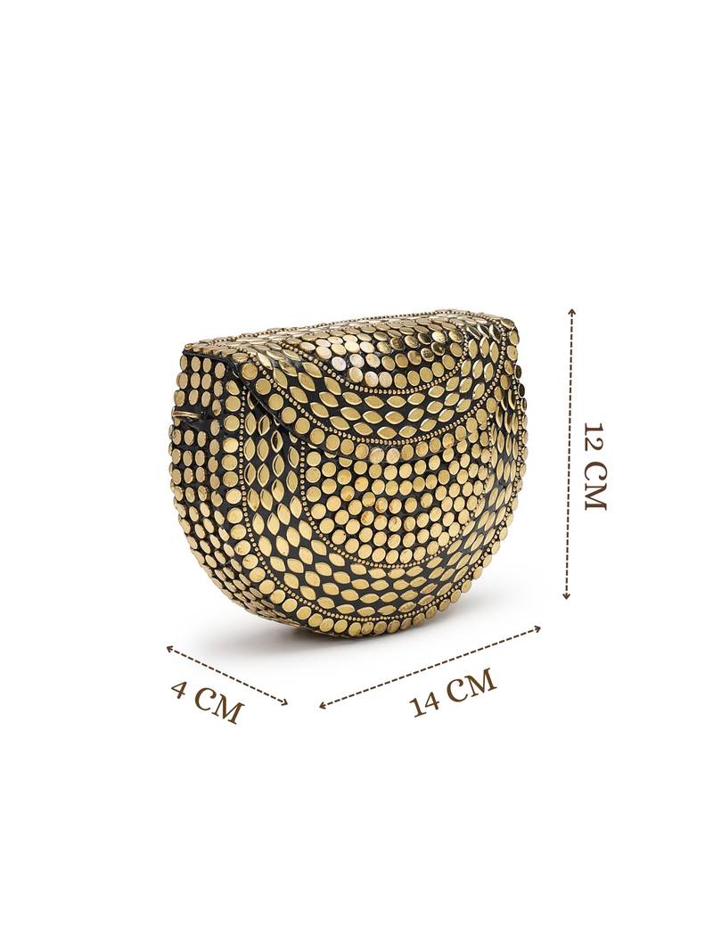 This Anekaant Clutch From The Metal Mirage Collection Is Styled In A Contemporary Half Moon Silhouette With A Durable Hard Case And Enamel Base. Showcasing A Striking Black Surface Enhanced With Metallic Gold Accents, It Is Richly Detailed With Polished Studs And Gold Tone Embellishments. The Design Features Concentric Circular Rows Of Round Studs Framed By Marquise Shaped Motifs, Creating A Bold Geometric Effect. Complete With A Detachable Sling Strap, This Clutch Combines Modern Elegance With Functionality, Making It An Ideal Accessory For Weddings, Festive Occasions, And Evening Events. Dimensions (L X H X W):14 X 12 X 4 Cm.