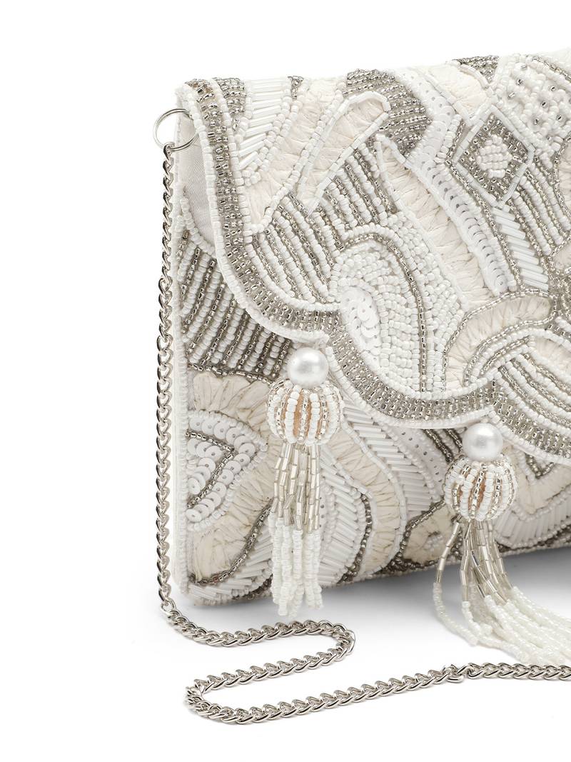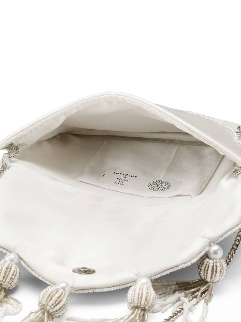 This Anekaant Embellished Sling Bag In A Graceful Blend Of Soft Ivory And Antique Silver Exudes Timeless Charm With A Festive Twist, From The Tassel Tales Sling Bag Collection. Crafted From High Quality Satin And Finished With A Sleek Satin Lining, It Features Ethnic Embellished Motifs With Intricate Detailing And Tasselled Accents. Designed With One Main Compartment And A Magnetic Button Closure, It Also Includes An Inner Slip Pocket And A Detachable Chain Strap.Stylish, Lightweight, And Perfect For Occasions Like Wedding Reception. Dimensions (L X H X W): 25 X 16 X 2 Cm.