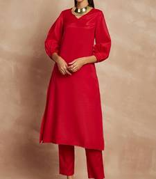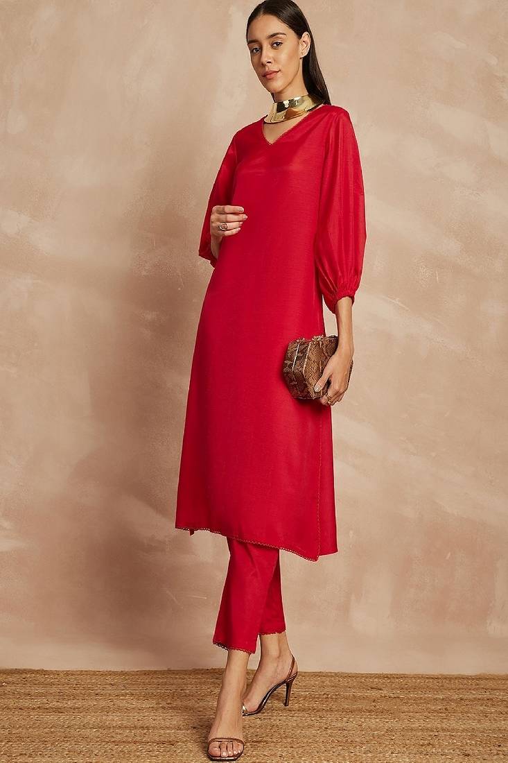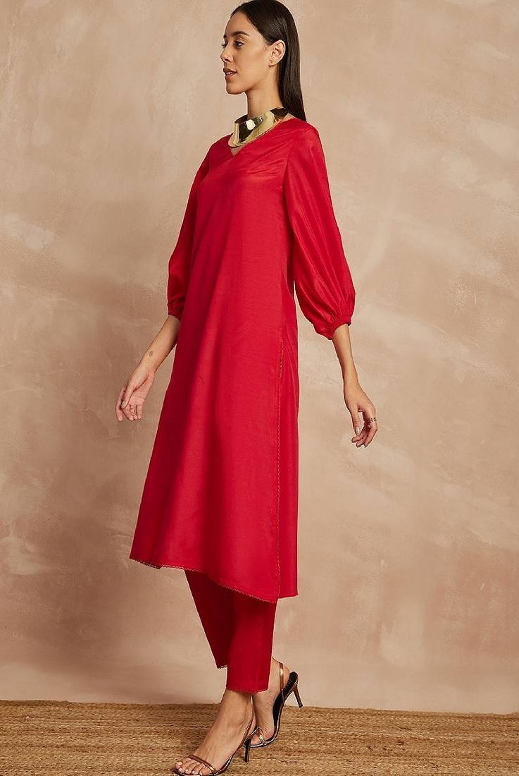 Red color v-neck three-quarter sleeves puffed sleeves a-line kurta with trousers