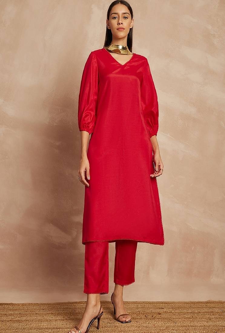 | Product Name | Red Color V Neck Three Quarter Sleeves Puffed Sleeves A Line Kurta With Trousers | |