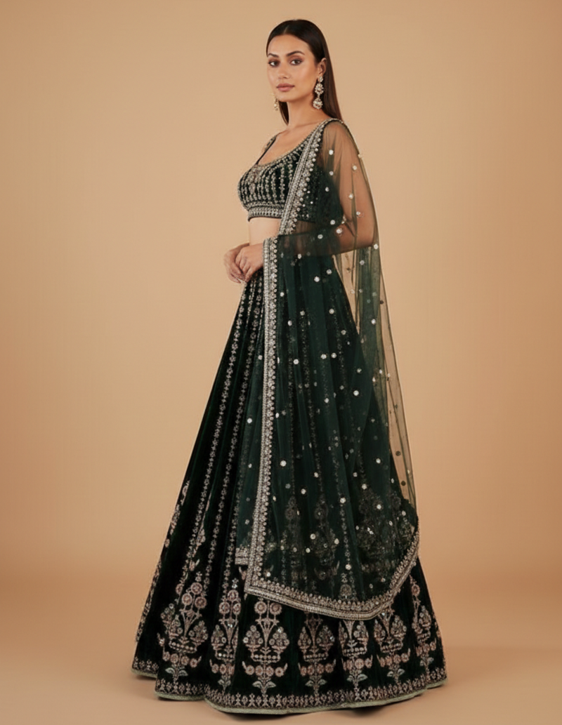 | Product Description | Add A Touch Of Sparkle To Your Look With This Ornate Teal Sequin Lehenga Set. Featuring Dense Sequin Embroidery And Intricate Floral Vine Patterns, This Piece Offers A High Fashion, Shimmering Finish. Ideal For Glamorous Presence At Weddings, Galas, And High Profile Celebrations. |