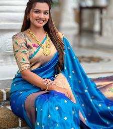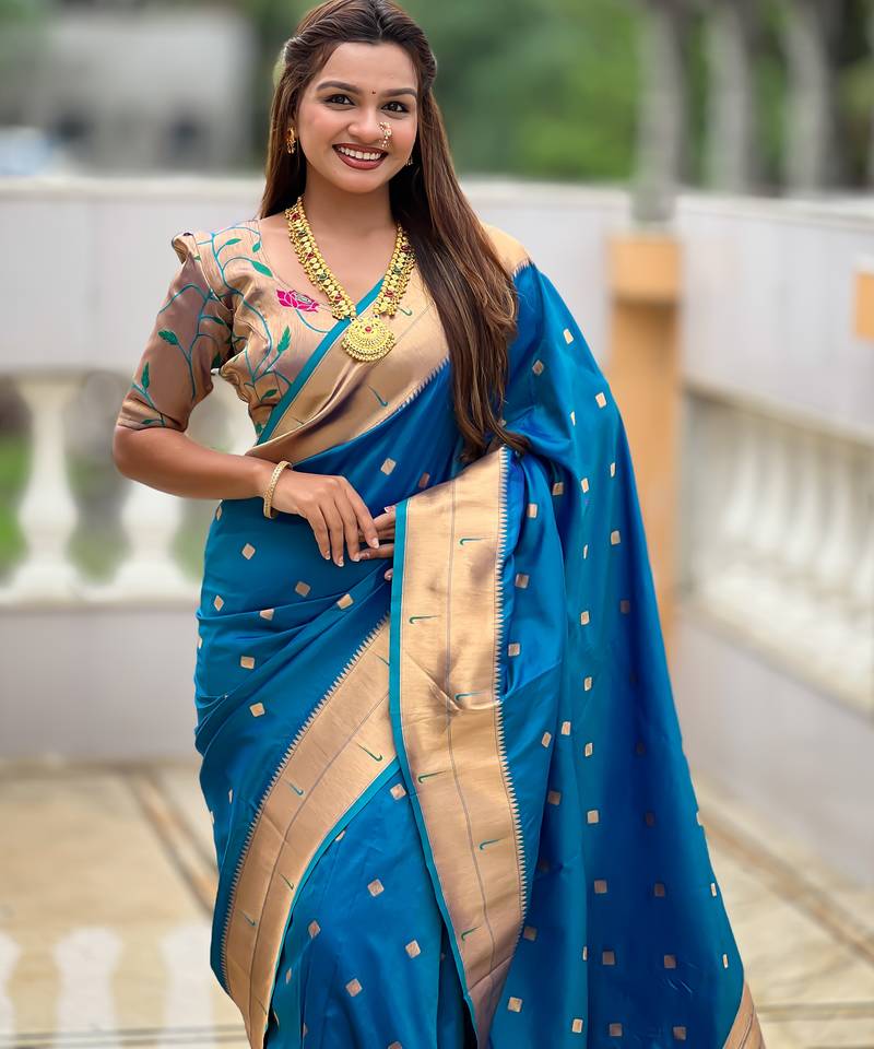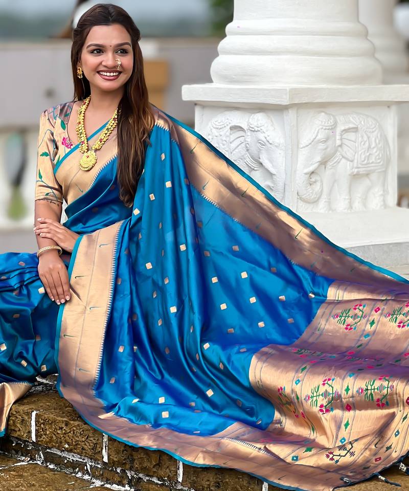 Soft paithani silk saree with zari weawing motifs design and meenakari weawing rich pallu