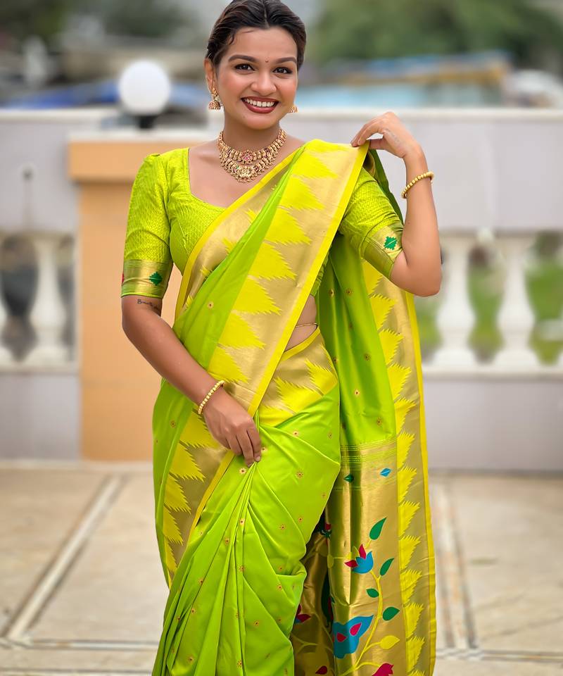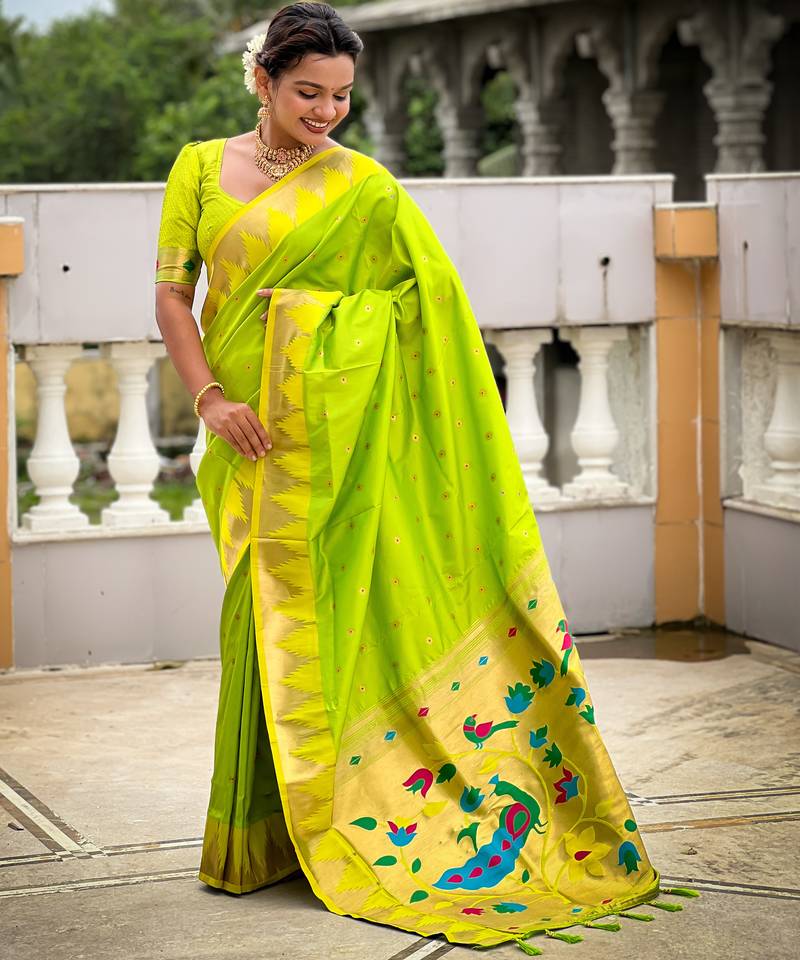 | • | Saree | : | Color- Parrot Green / Fabric- Paithani Silk |