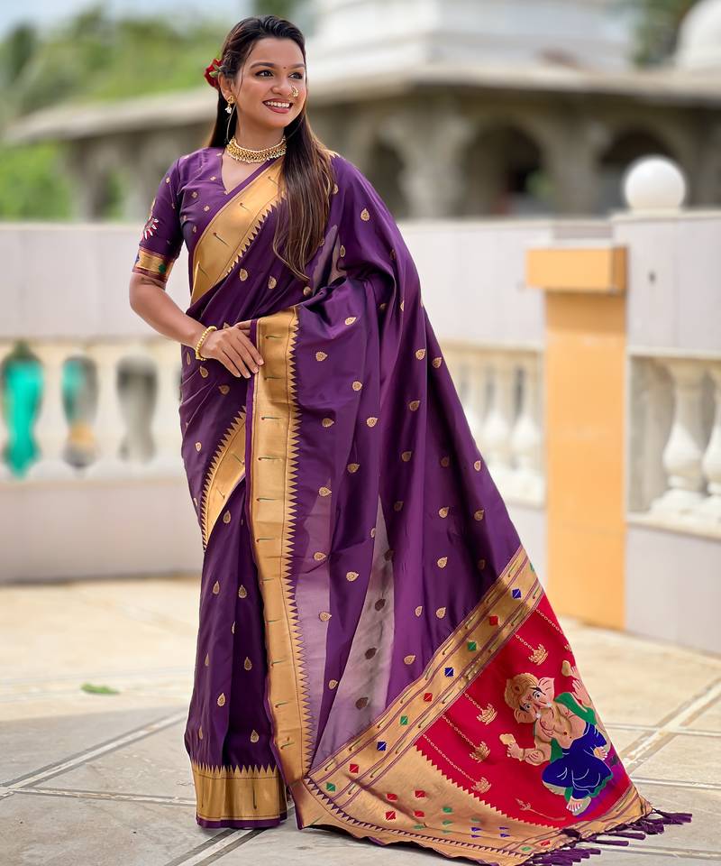 Soft paithani silk saree with zari weawing motifs design and meenakari weawing rich pallu