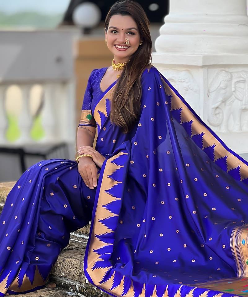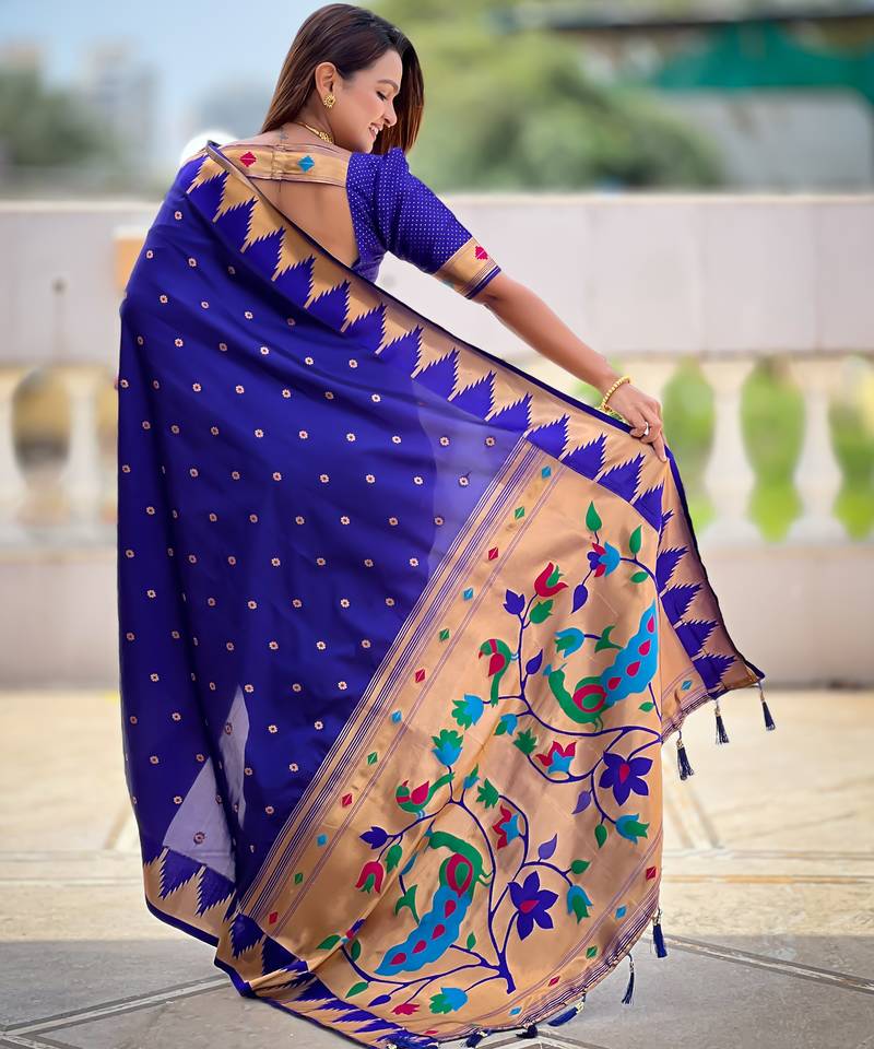 Soft paithani silk saree with zari weawing motifs design and meenakari weawing rich pallu