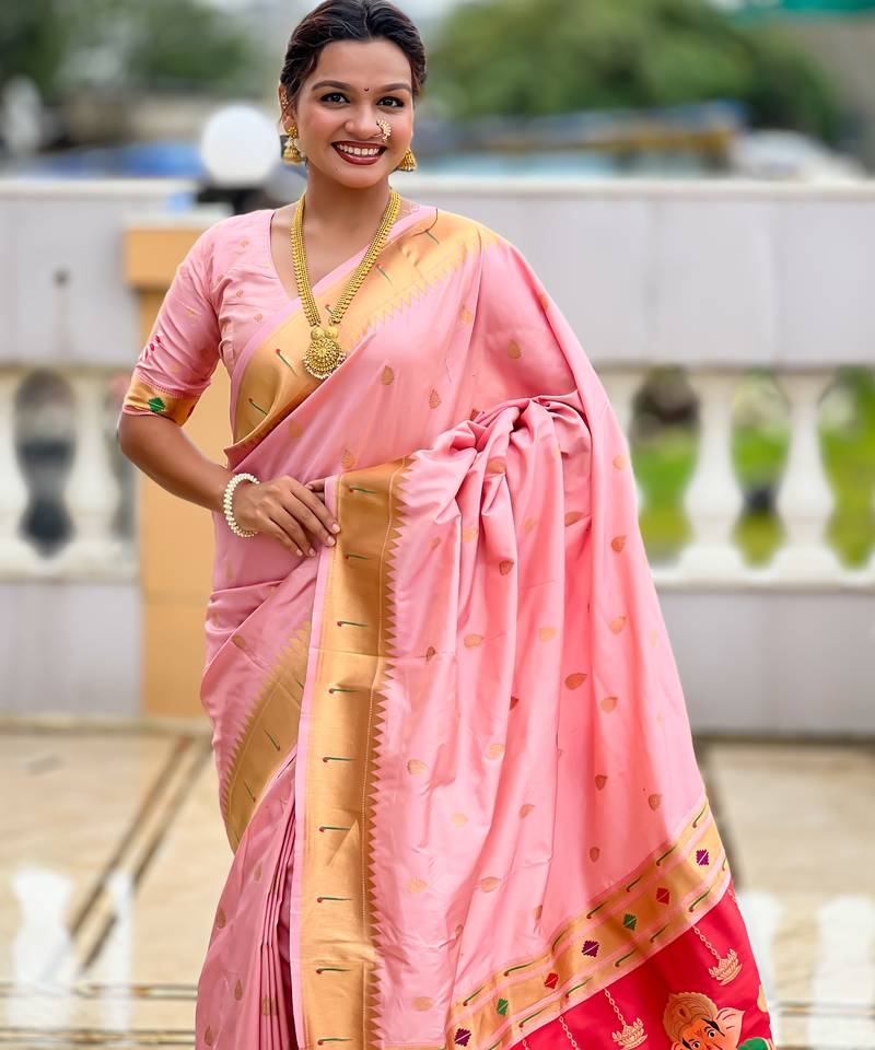 Soft paithani silk saree with zari weawing motifs design and meenakari weawing rich pallu