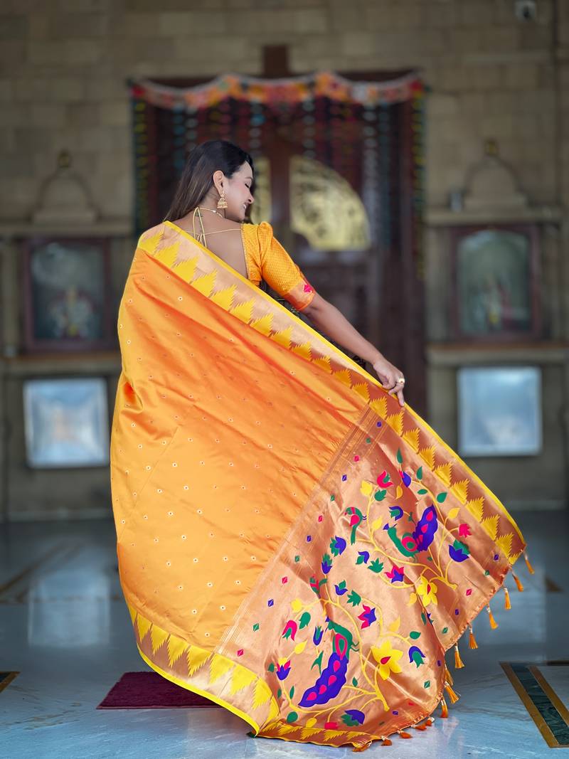 Soft paithani silk saree with zari weawing motifs design and meenakari weawing rich pallu